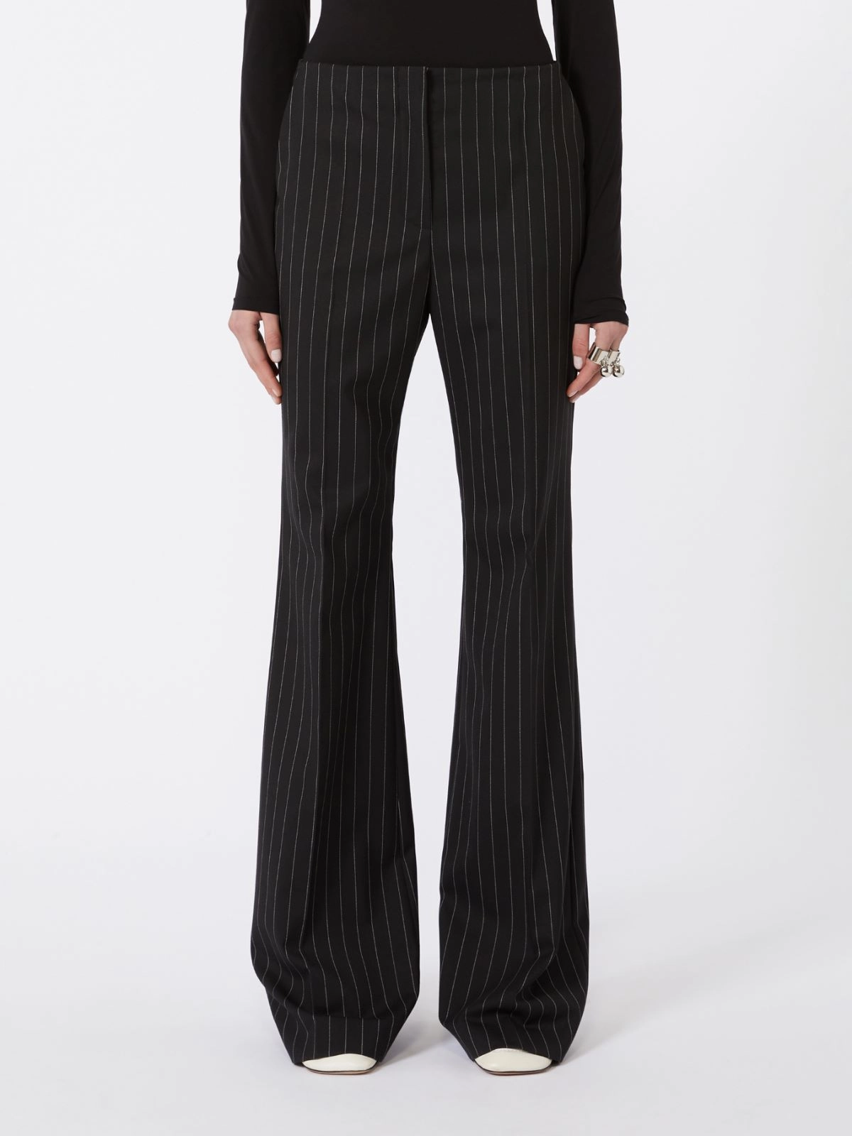 Flared line and low waist define these stretch wool gabardine trousers with a pinstripe pattern. The pressed crease visually elongates the silhouette.