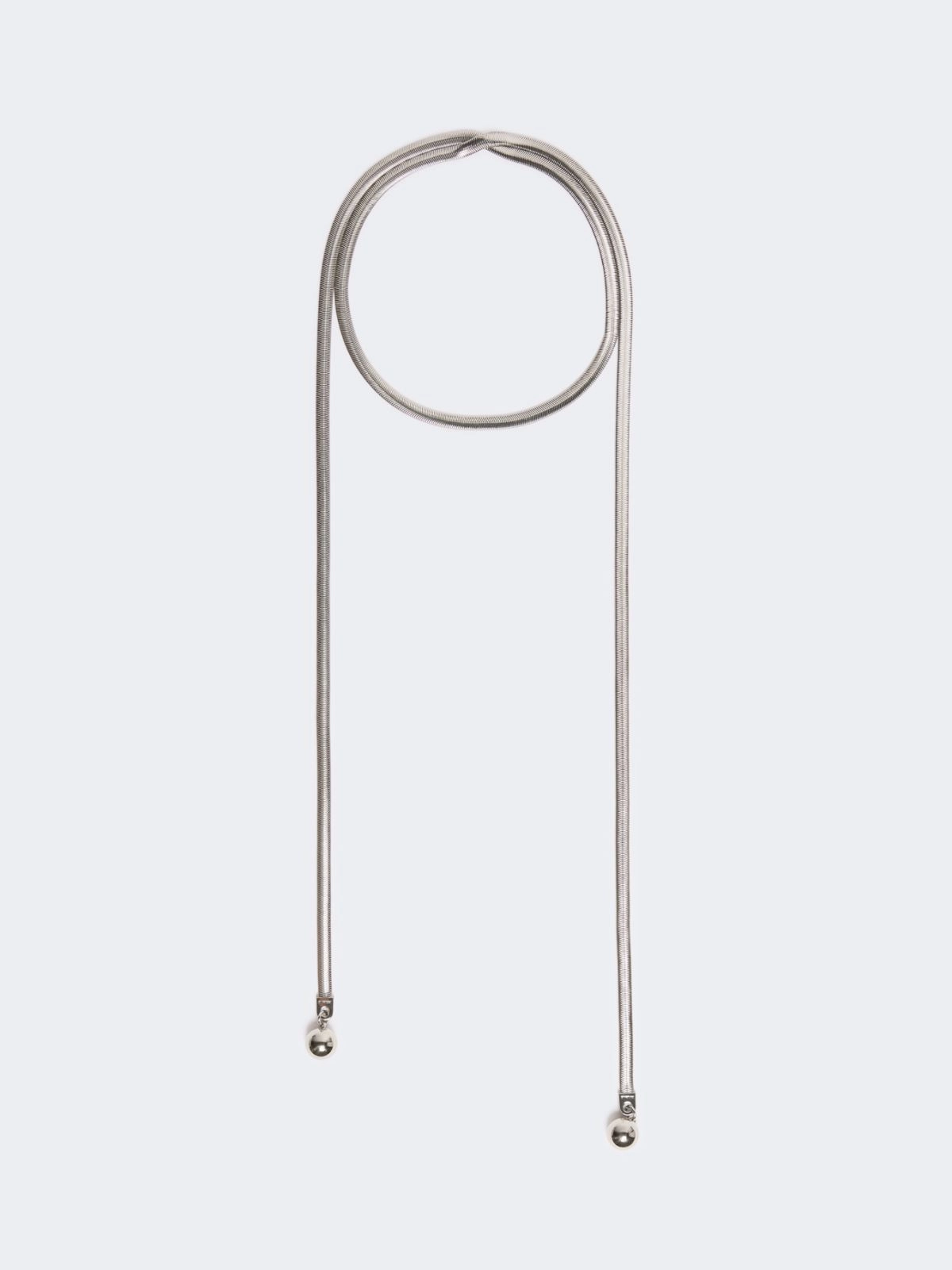 Versatile necklace made of metal chain, with baubles at the ends. To wear as a choker or as a long double-strand necklace.
